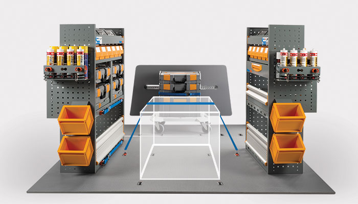 Scaffalature, cassettiere e palchetti compongono una vera e propria officina mobile, dove ogni strumento ha il proprio posto ed è sempre a portata di mano.